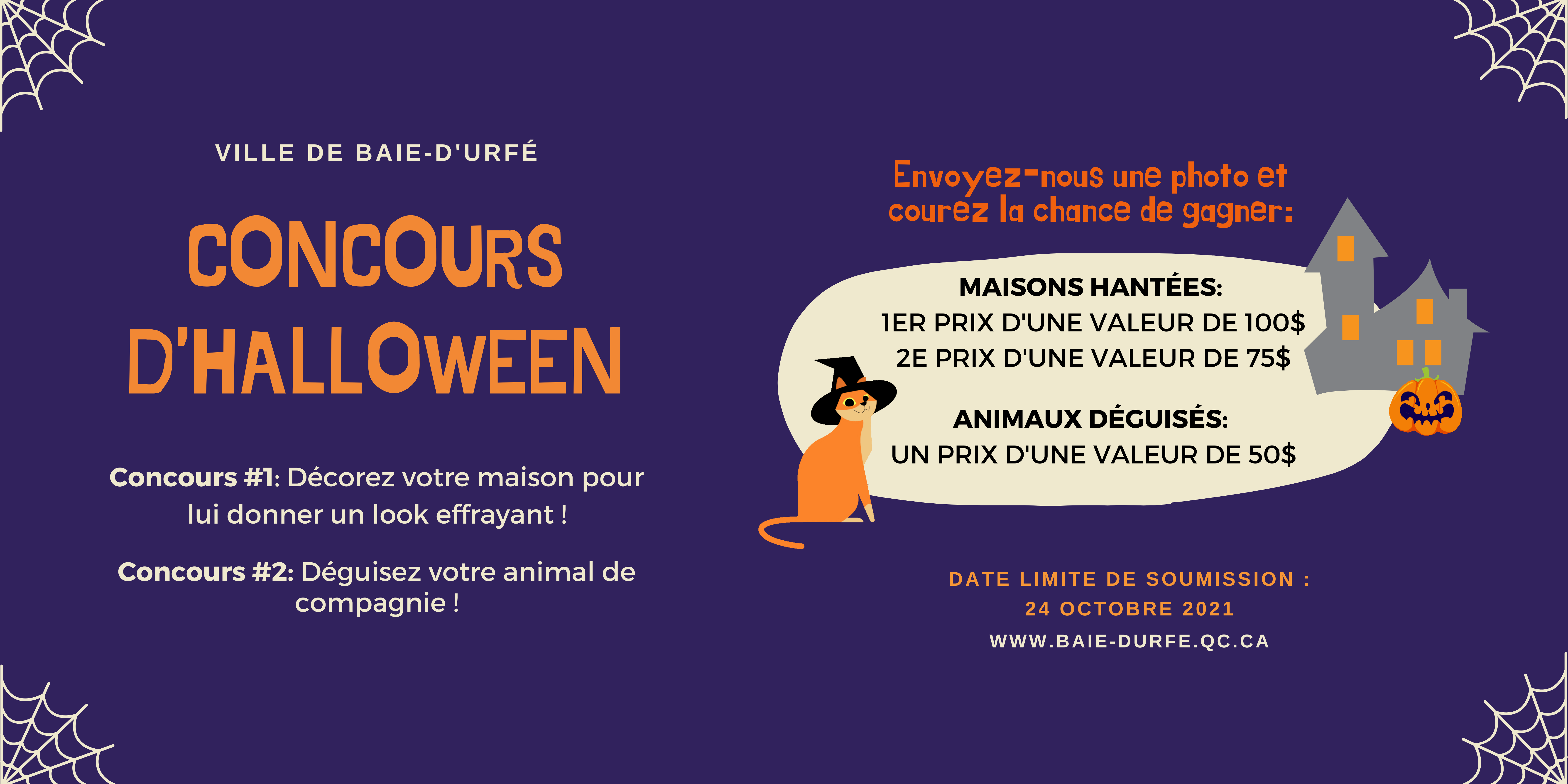 POUR PARTICIPER : Vous avez jusqu’au 24 octobre 2021 inclusivement pour nous envoyer une photo de votre maison décorée ou de votre animal de compagnie déguisé au communications@baie-durfe.qc.ca en indiquant les informations suivantes : Prénom et nom du participant, adresse complète, numéro de téléphone et adresse courriel.