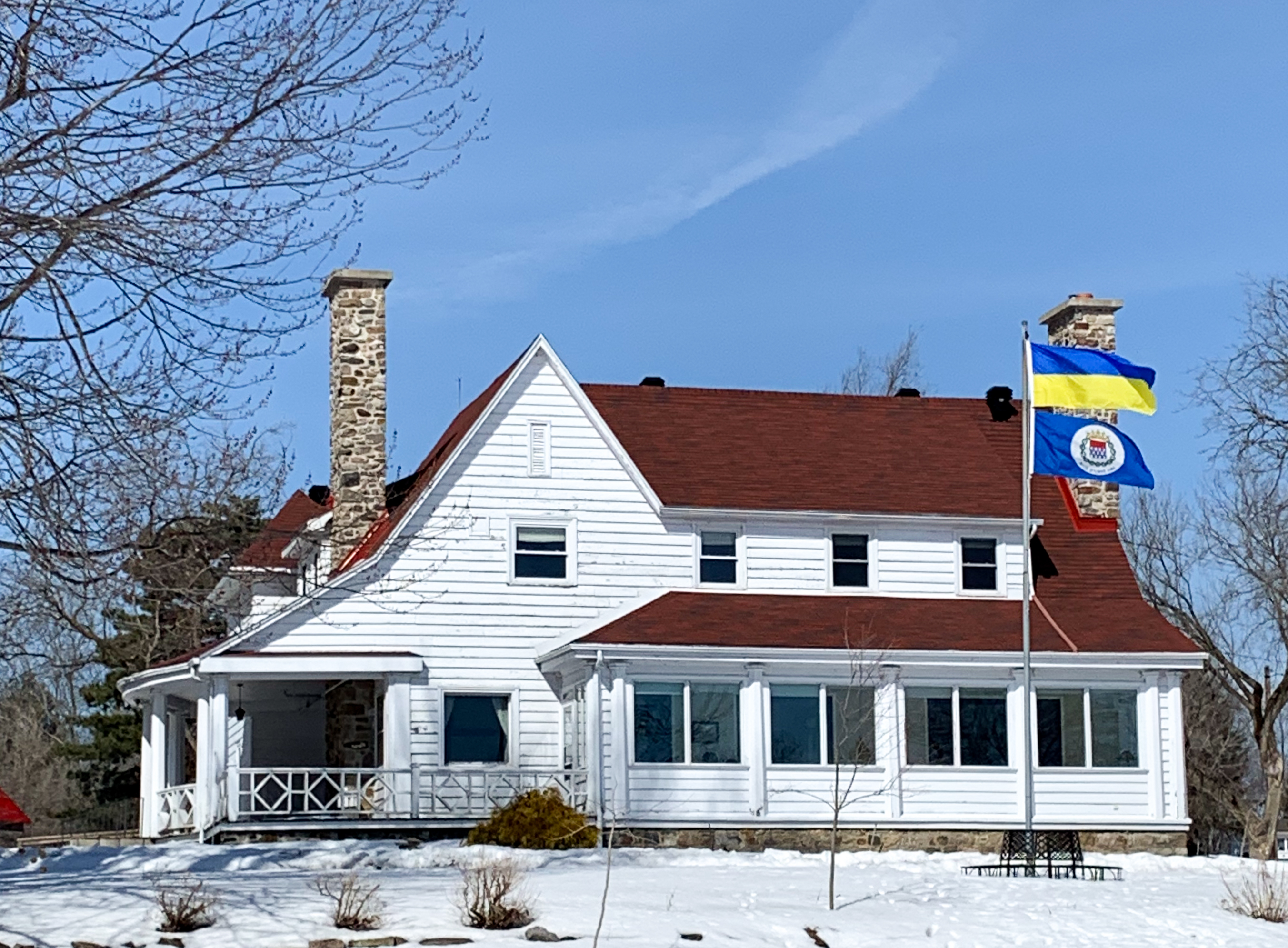 La Ville de Baie-D’Urfé se mobilise afin d’apporter son soutien à la communauté ukrainienne. En signe de solidarité, la ville a hissé le drapeau de l’Ukraine face au Centre communautaire Fritz et a illuminé son hôtel de ville en bleu et jaune.